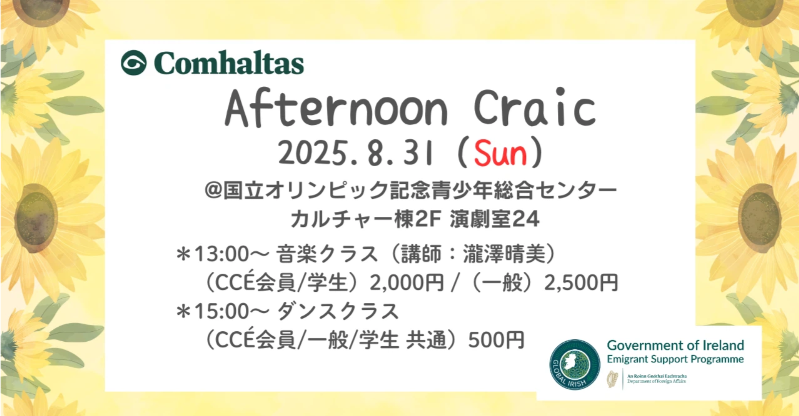 2025年8月31日(日)開催のAfternoon Craic(音楽/ダンスクラス)のご案内です。