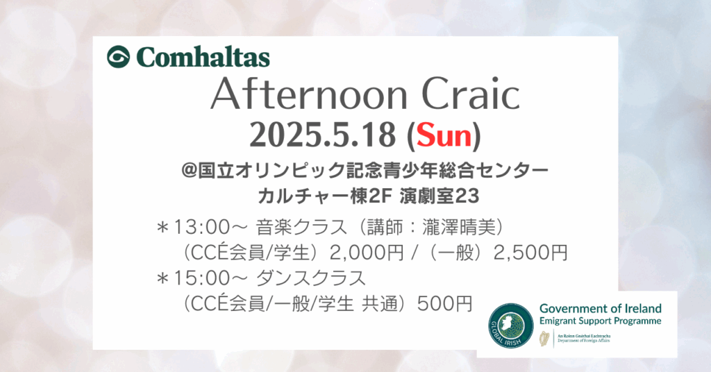 2025年5月18日(日)開催のAfternoon Craic(音楽/ダンスクラス)のご案内です。