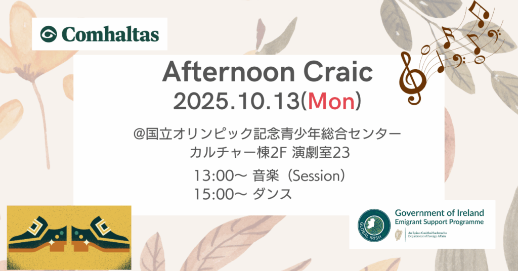 2025年10月13日(月・祝)開催のAfternoon Craic(セッション/ダンスクラス)のご案内です。