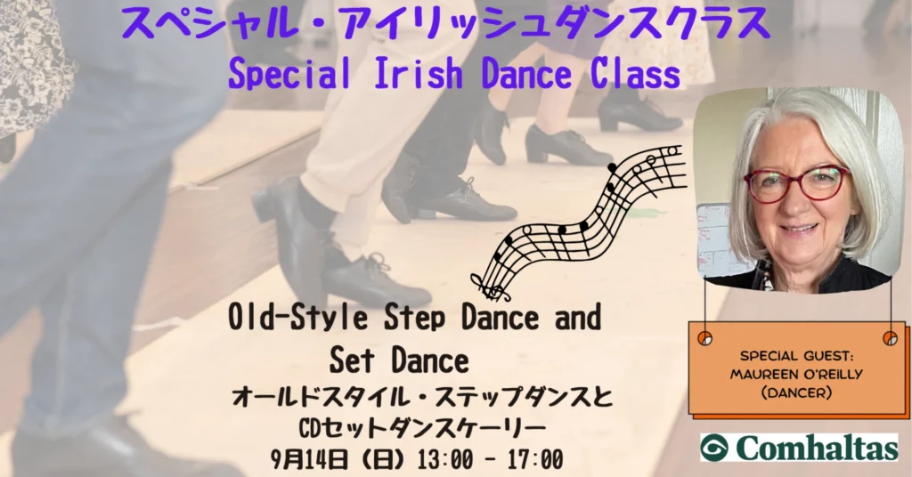 9/14(日)、DLスタジオ代々木でダンスクラスを開催します。今回はアイルランドから特別ゲストとしてMaurenn O’Reilly(モーリーン・オライリー)さんが参加。オールドスタイル・ステップダンスの練習会とCDケーリーを開催いたします。